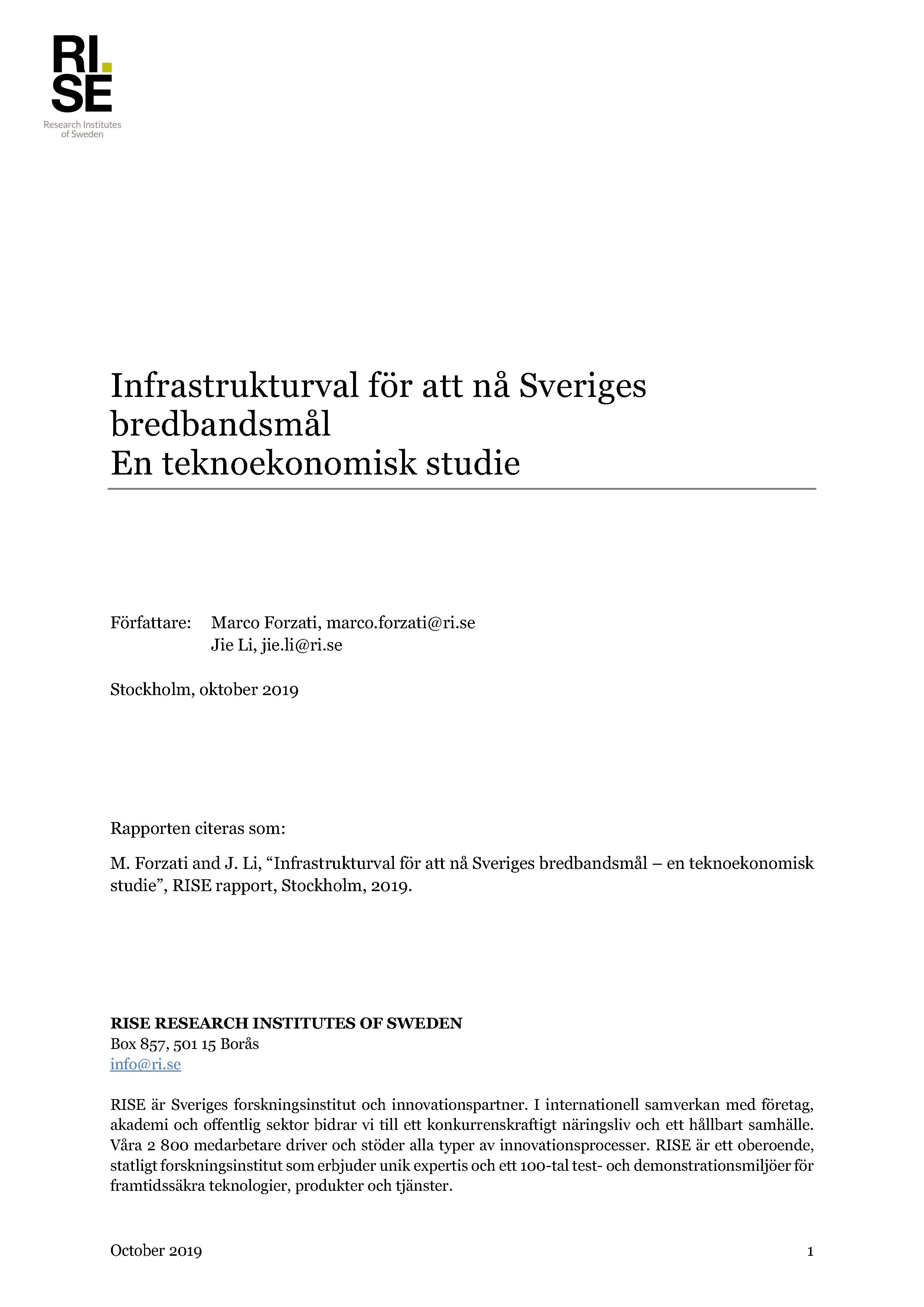 Infrastrukturval för att nå Sveriges bredbandsmål – en teknoekonomisk studiePå uppdrag av Svenska Stadsnätsföreningen har det statliga forskningsinstitutet RISE genomfört en analys över konsekvenserna med att ersätta den fortsatta fiberutbyggnaden med trådlösa alternativ. Rapporten visar att de enklare lösningar som framförts som tänkbara alternativ till fortsatt fiberutbyggnad riskerar att göra det svårare för företag och hushåll på landsbygden att ta del av framtida digitala tjänster.